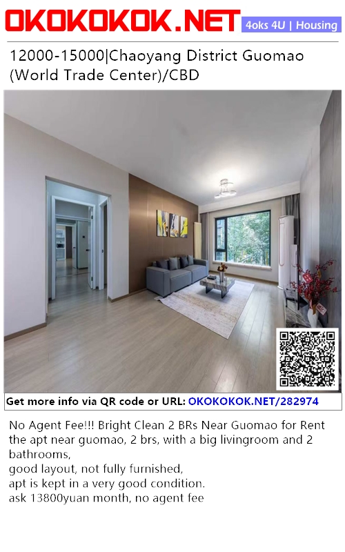 No Agent Fee!!! Bright Clean 2 BRs Near Guomao for Rent