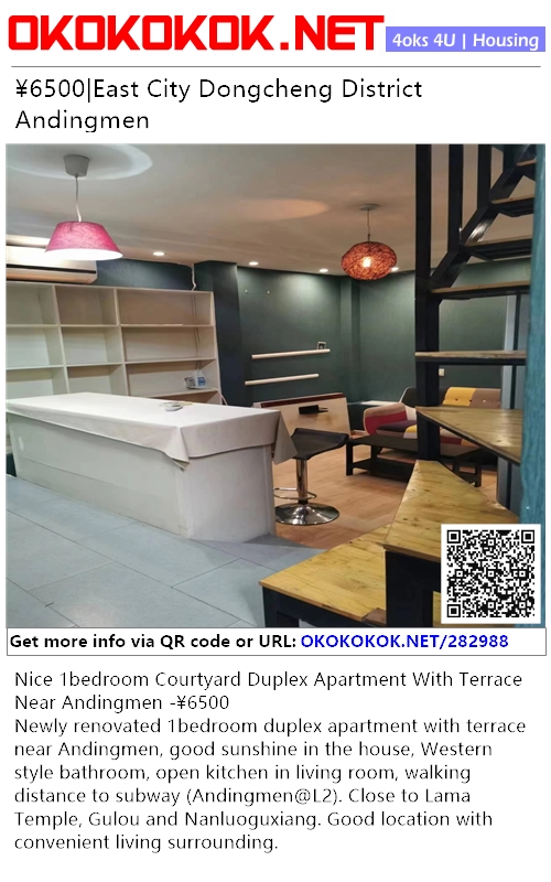 Newly renovated 1bedroom duplex apartment with terrace near Andingmen, good sunshine in the house, Western style bathroom, open kitchen in living room, walking distance to subway (Andingmen@L2). Close to Lama Temple, Gulou and Nanluoguxiang. Good location with convenient living surrounding.