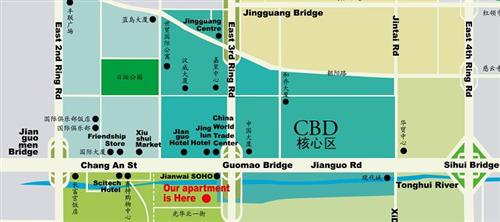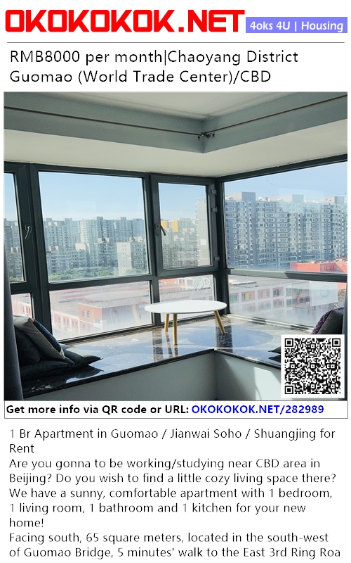 Facing south, 65 square meters, located in the south-west of Guomao Bridge, 5 minutes' walk to the East 3rd Ring Road, 10 minutes' walk to Jianwai Soho, Metro 10 Shuangjing Station or Metro 7 Guangqumenwai Station. 13th of 14-storey, wooden floor, modern-decorated, fully furnished with IKEA furniture, TV set, refrigerator, washing machine, air-conditioner and water heater. Internet and 24-hour elevator available. Easy shopping and eating-out with lots of supermarkets, 24-hours mini marts, groceries, restaurants, bars, banks, bakeries, pharmacies and laundries around.