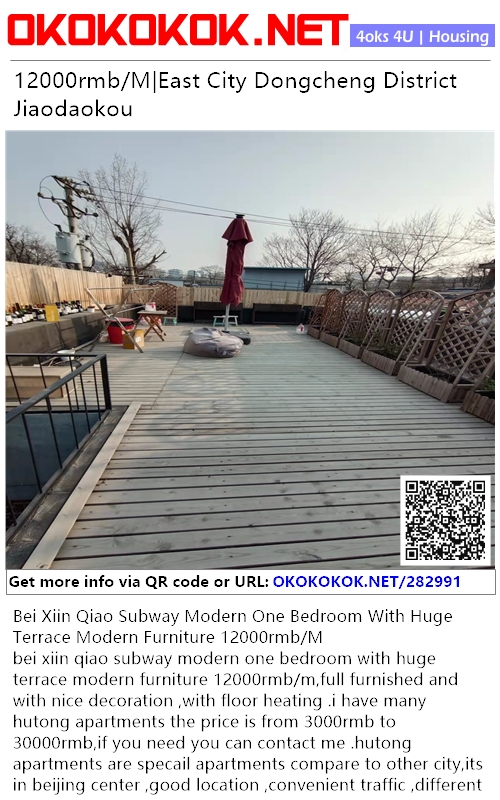 bei xiin qiao subway modern one bedroom with huge terrace modern furniture 12000rmb/m,full furnished and with nice decoration ,with floor heating .i have many hutong apartments the price is from 3000rmb to 30000rmb,if you need you can contact me .hutong apartments are specail apartments compare to other city,its in beijing center ,good location ,convenient traffic ,different living experience,it worths a liffetime.