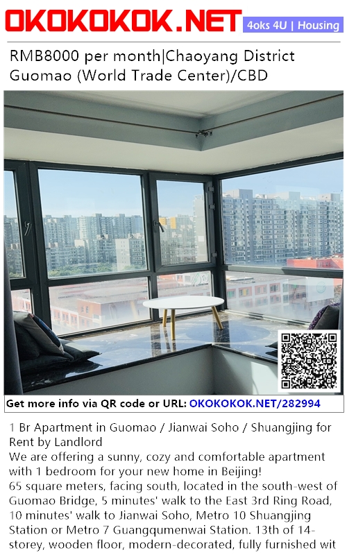 65 square meters, facing south, located in the south-west of Guomao Bridge, 5 minutes' walk to the East 3rd Ring Road, 10 minutes' walk to Jianwai Soho, Metro 10 Shuangjing Station or Metro 7 Guangqumenwai Station. 13th of 14-storey, wooden floor, modern-decorated, fully furnished with IKEA furniture, TV set, refrigerator, washing machine, air-conditioner and water heater. Internet and 24-hour elevator available. Easy shopping and eating-out with lots of supermarkets, 24-hours mini marts, groceries, restaurants, bars, banks, bakeries, pharmacies and laundries around.