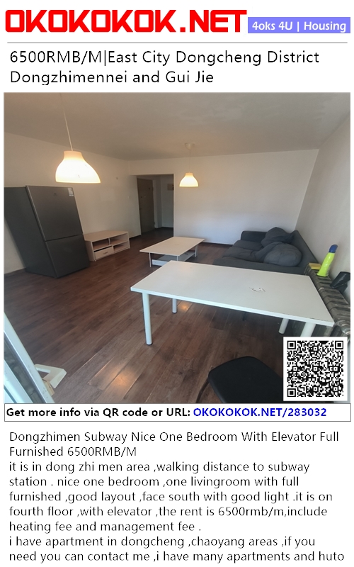it is in dong zhi men area ,walking distance to subway station . nice one bedroom ,one livingroom with full furnished ,good layout ,face south with good light .it is on fourth floor ,with elevator ,the rent is 6500rmb/m,include heating fee and management fee .