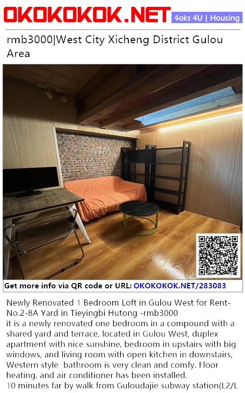Newly Renovated 1 Bedroom Loft in Gulou West for Rent-No.2-8A Yard in Tieyingbi Hutong -rmb3000