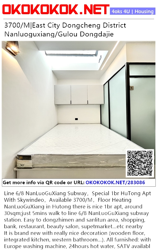 NanLuoGuXiang in Hutong there is nice 1br apt, around 30sqm;just 5mins walk to line 6/8 NanLuoGuXiang subway station. Easy to dongzhimen and sanlitun area, shopping, bank, restaurant, beauty salon, supetmarket…etc nearby